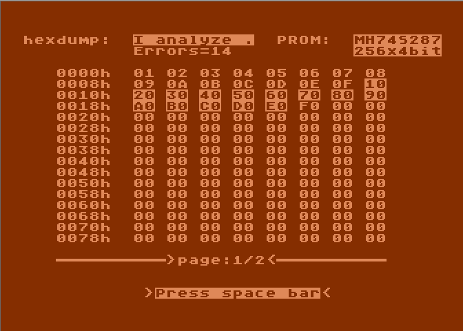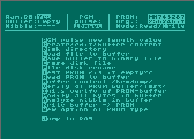 Ako vidieť počet vydaných verzií k dnešnému dňu utešene narástol (za 8 mesiacov 10 verzií, nehovoriac o tom že predtým napísanie základnej mustry trvalo taktiež pekných pár mesiacov). Verzia 2.6 obsahuje ešte jeden nový nápad - máme tu k dispozícii analýzu obsahu buffra a teda v menu pribudla ďalšia položka - Analyze nibble in buffer. Je to zase vec ktorá má uľahčiť kontrolu správnosti dostupných údajov ktoré chceme naprogramovať do PROM pamäte. A ako vždy a stále platí - najlepšie je vždy používať najnovšiu verziu programu.